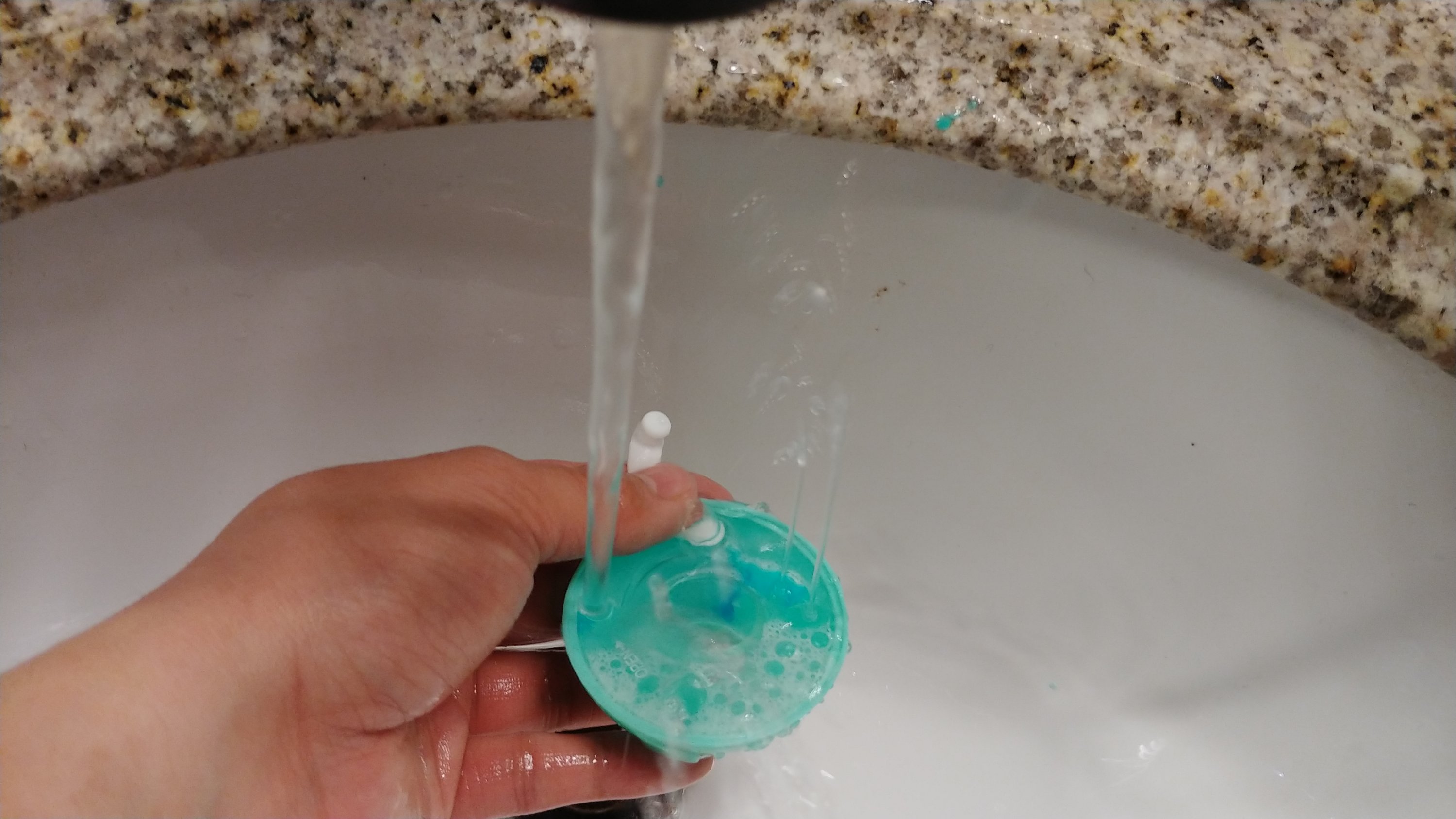 I quickly scanned the instructions. Liquid toothpaste? What’s that? I have never heard of it before, but you know what? Now I have. A quick Amazon search yielded 2, one of which was Kosher. Alrighty then. I’ll just jam my gel toothpaste into this tiny hole and mix with water to try and make a liquid toothpaste. In retrospect, I probably should have done that outside the receptacle. Then I contemplated throwing it all away because it really did look like someone had already used it before me. FOR THE PATIENTS AND DENTAL HYGIENE!